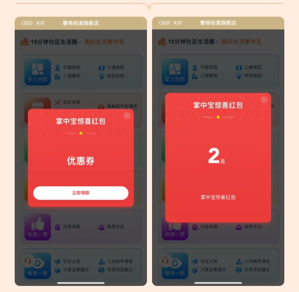 注意!刚进入“掌中宝”曹杨场景页面时,屏幕中会自动跳出一个 领取优惠券 的弹窗,领取后当日即可在社区食堂使用哦~(“掌中宝”惊喜红包每天可领取一个,红包类型有现金券、食品等)