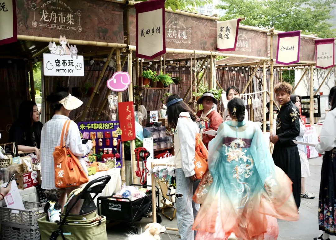 现场不仅有龙舟竞渡的速度与激情,还有以 “龙舟上河图” 为主题,在天安千树商场和苏州河梦清园环保主题公园推出的两大特色市集——一边是复刻千年宋韵的“水岸繁华”,一边是穿越时空的“沉浸剧本游”和“龙狮巡游盛宴”,这就带你去看看这两场盛会如何赋能体育赛事。