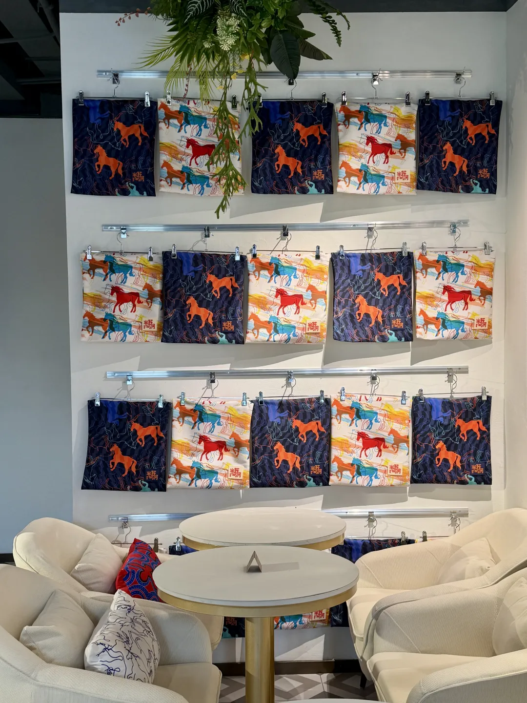 除了手中的小物,店内的陈列也进行了升级,最引人注目的,莫过于一面由“马年奔腾”帆布袋装饰而成的创意墙面。印有奔腾骏马图案的帆布袋整齐地悬挂排列,创意组成一面帆布袋墙,仿佛一群骏马在墙面上飞驰,既充满了动感的视觉冲击力,又寓意着普陀在城市发展道路上马力全开、勇往直前。这面独特的“帆布袋墙”已成为店内新晋拍照打卡点。