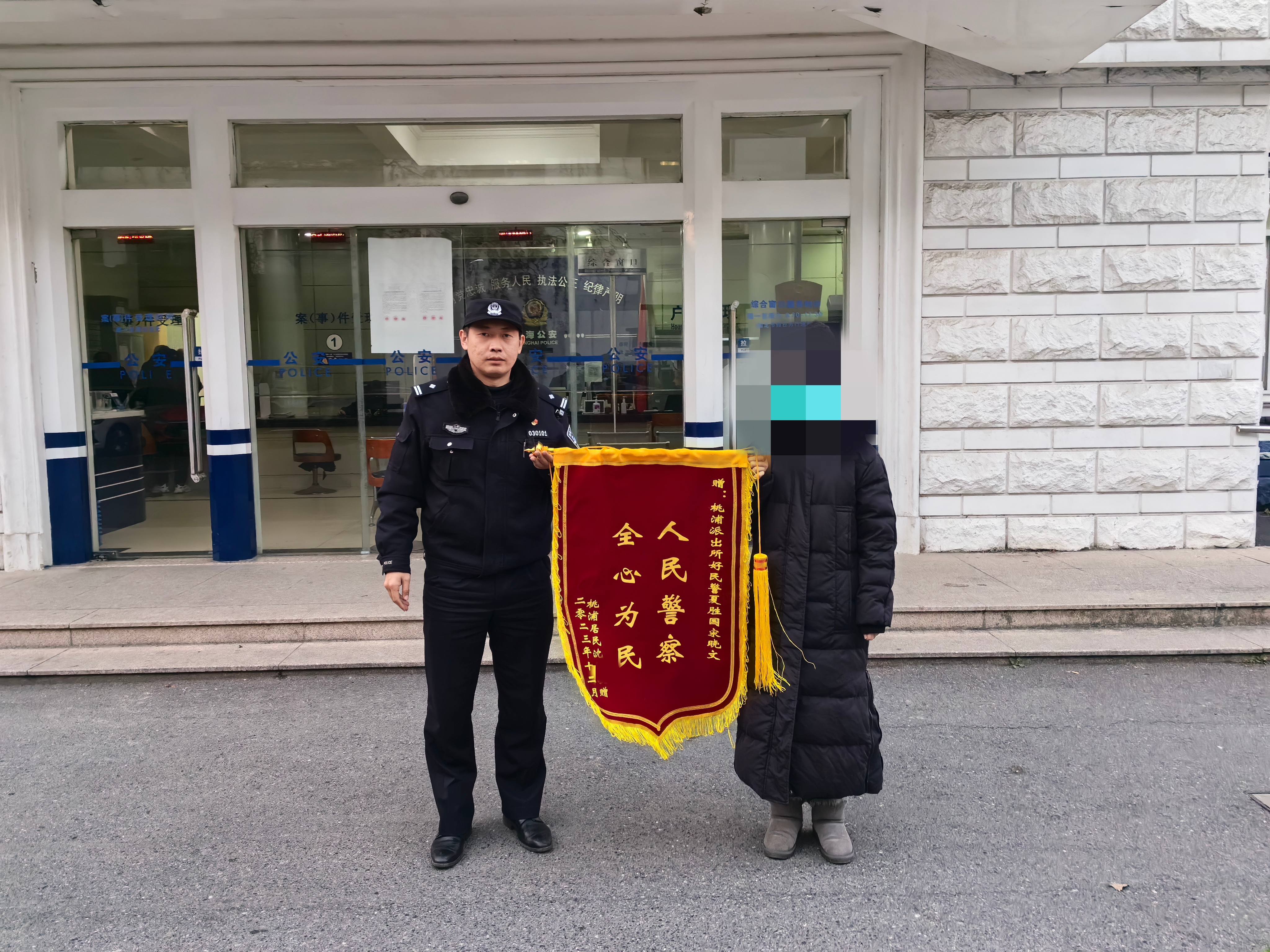 12月15日,失主沈女士专程来到普陀公安分局桃浦派出所,向民警夏胜国、辅警宋晓文赠送锦旗,感谢两人为其追回父亲的救命钱。