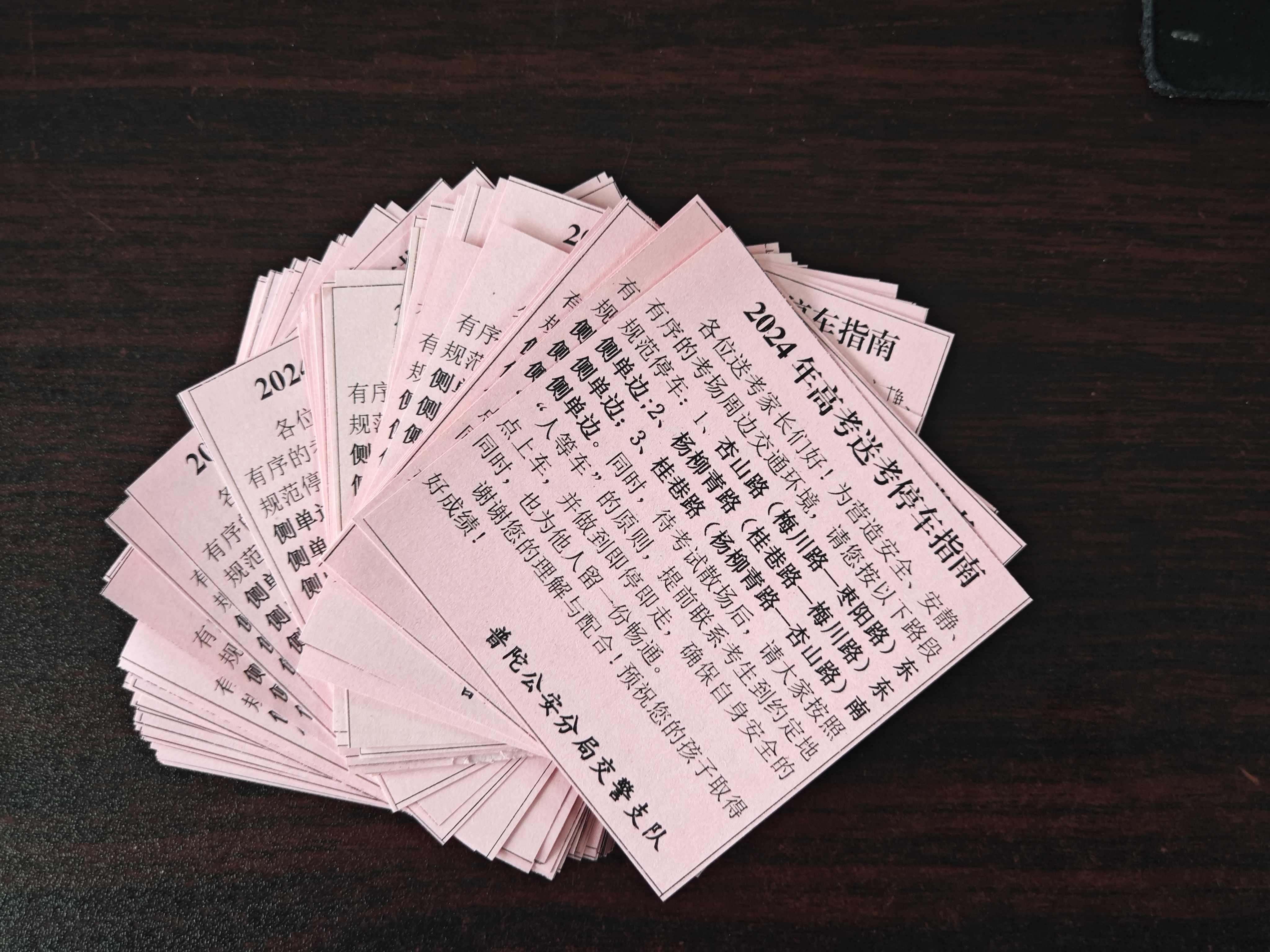 “你好,请按规定位置停车哦!”同往年一样,普陀警方按照惯例制作了暖心的“停车指南”卡片,联合志愿者在现场发放,便于不熟悉考场周边道路环境的送考车辆能够尽快找到车位停靠。同时,为最大程度加大送考车辆停车供给,交警支队民警充分挖掘了考点周边的公共停车资源,设置停车引导标志,视情开放临停车位。