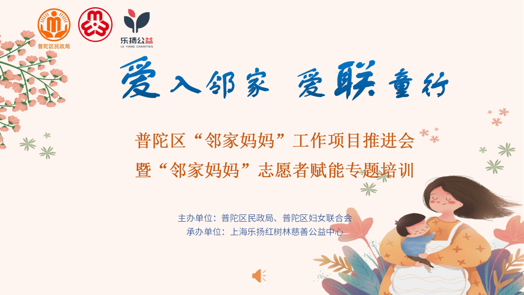 来源: 上海普陀3月28日下午,区民政局携手区妇联召开“爱入邻家·爱联童行——普陀区‘邻家妈妈’工作项目推进会暨‘邻家妈妈’志愿者赋能专题培训”。