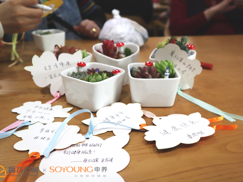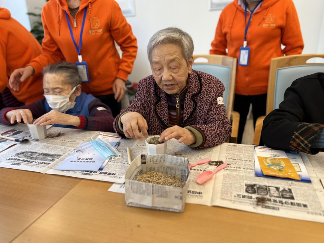 普陀区申养镇坪路望年荟养老院、普陀区第一老年福利院等机构组织了绿植栽培活动,老人们在爱心志愿者和工作人员帮助下种下寓意美好的“长寿树”,再挂上小饰品,并把对未来美好的祈愿写在一张张卡片上,祝愿大家身体健康。