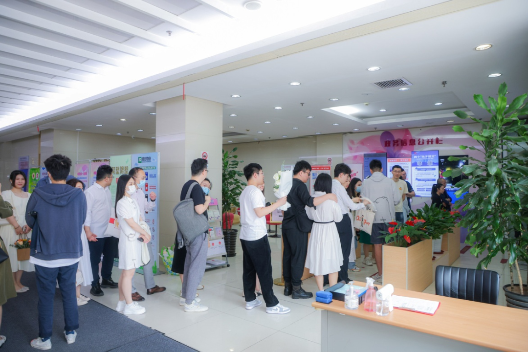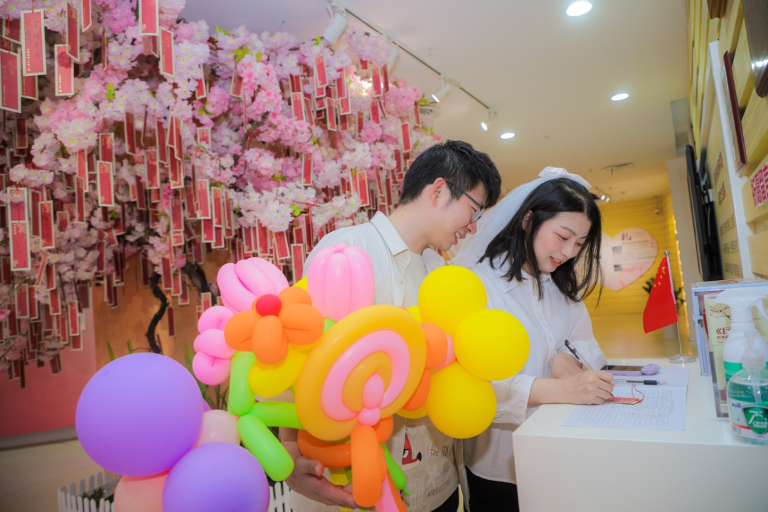 527因谐音“吾爱妻”的特别寓意,使今天同样成为新人追捧的结婚高峰日。全天共办理结婚登记87对,其中“跨区通办”50对。