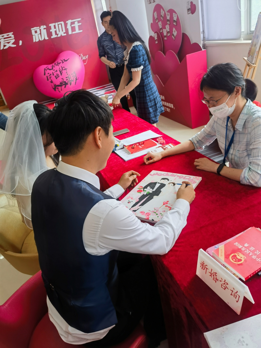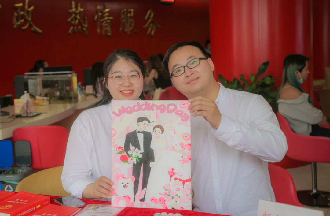 带着美好祝愿,普陀区贴心的为当天领证的新人举办趣味DIY手绘活动,一起绘出两个人的甜蜜。