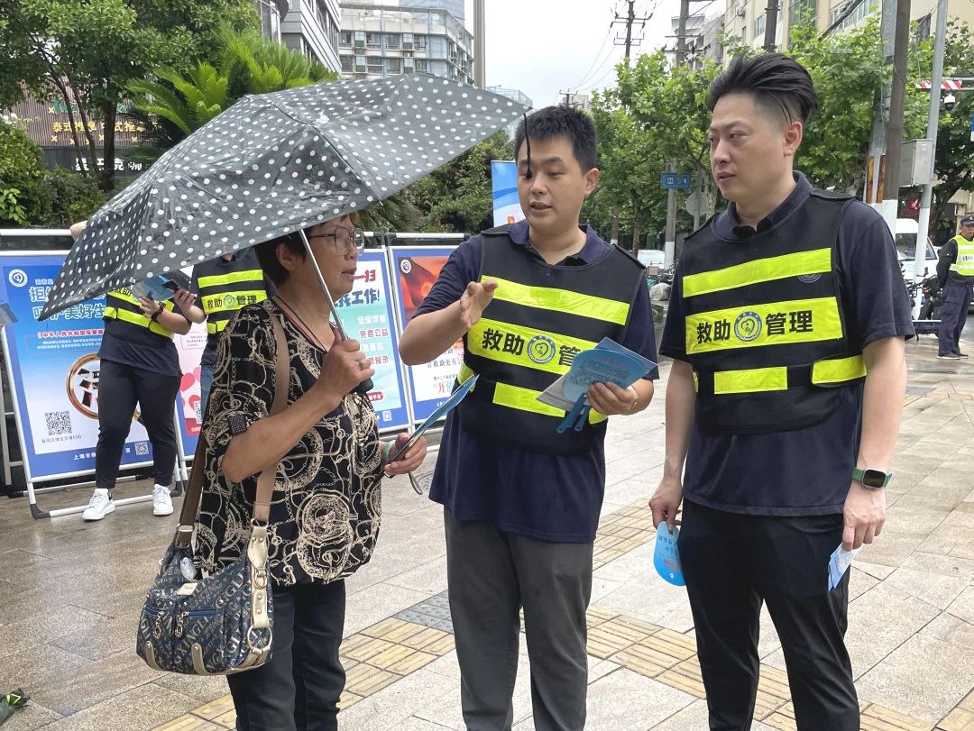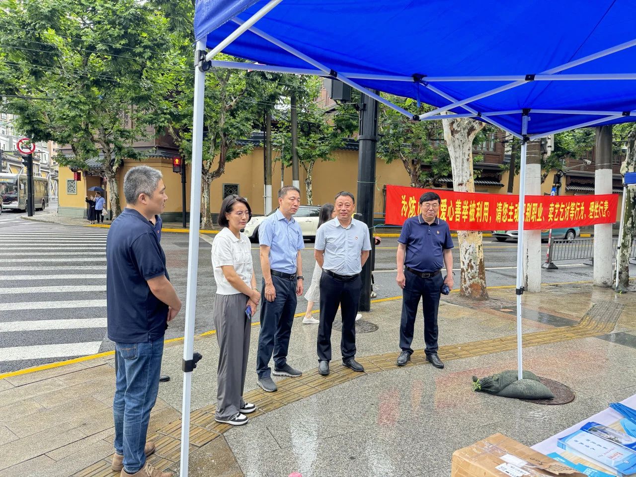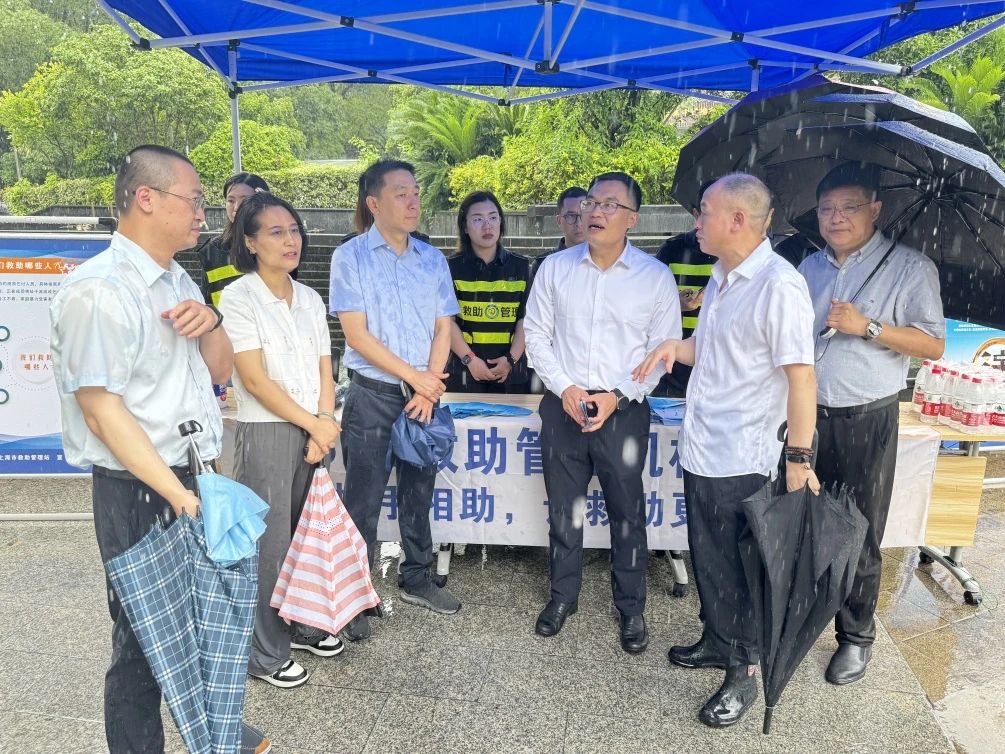 6月19日早晨,普陀区救助管理站联合长寿路街道办事处、玉佛禅寺在长寿路安远路设立宣传展示点。市民政局、市救助管理站、区民政局等有关领导莅临现场指导工作。