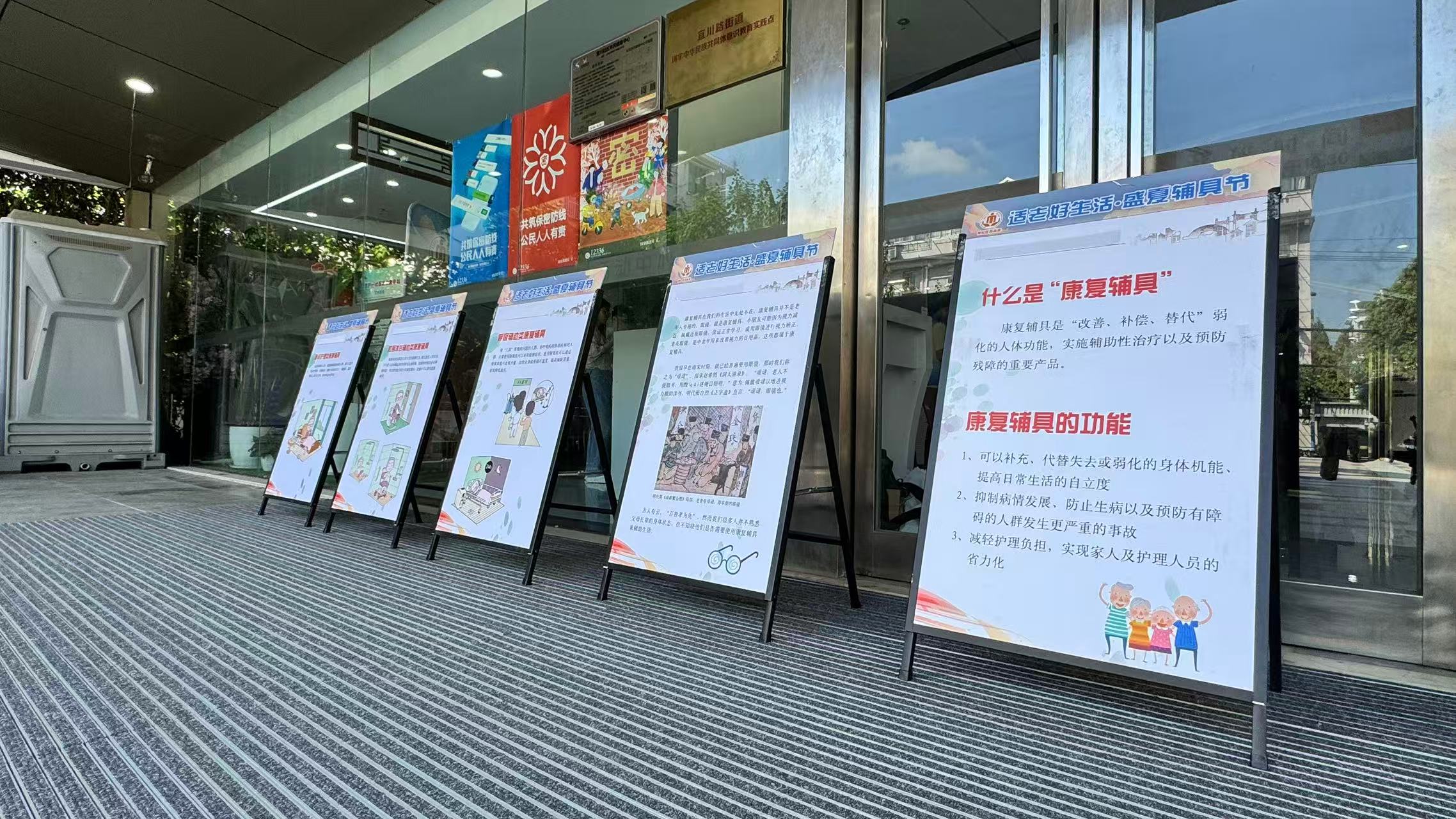 康复辅具宣传区通过展板科普、宣传册发放和实物展示,系统介绍了常见康复辅具的功能、适用场景及使用技巧。工作人员围绕轮椅、助行器等常用设备,为老人讲解正确使用方法,并详细说明康复辅具租赁与购买的补贴政策,包括补贴对象、补贴标准及申请渠道,吸引众多社区老人驻足咨询和现场体验。