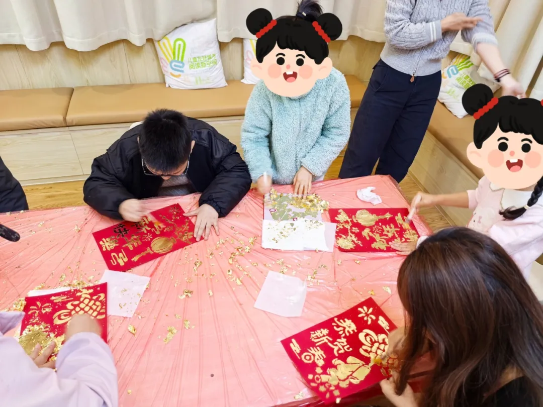 千年传承的金箔薄如蝉翼,孩子们屏息凝神,用镊子轻夹金箔细心粘贴、修饰,将“恭贺新春”“新年快乐”的祝福融入创作。金辉闪耀的画作背后,是孩子们专注力与动手能力的悄然提升,更是在一贴一粘间,对传统工艺匠心的真切感悟,让传统文化的审美素养在孩子们心中慢慢生长。
