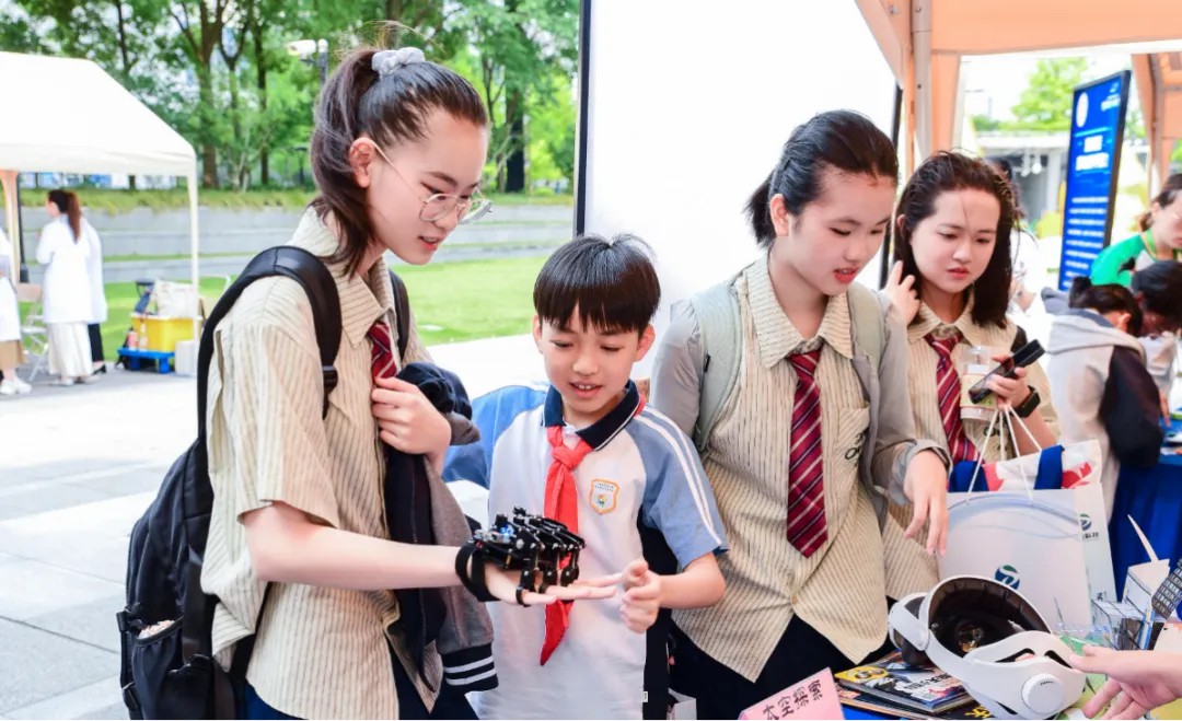 科普展区中,上海太敬机器人股份有限公司带来“智享生活”主题展,涵盖教育机器人编程、仿人机器人舞蹈表演及机器狗竞技互动等内容;司法鉴定科学研究院联动上师大二实验和晋元高中的“双师课堂”开启了科教融合的新模式。仁和全域公司展示脑机交互AI智能镜等眼部健康产品,融合生物科技与智能硬件;上外普陀实验学校呈现航天科技主题,提供卫星模型展示与火箭发射VR体验。