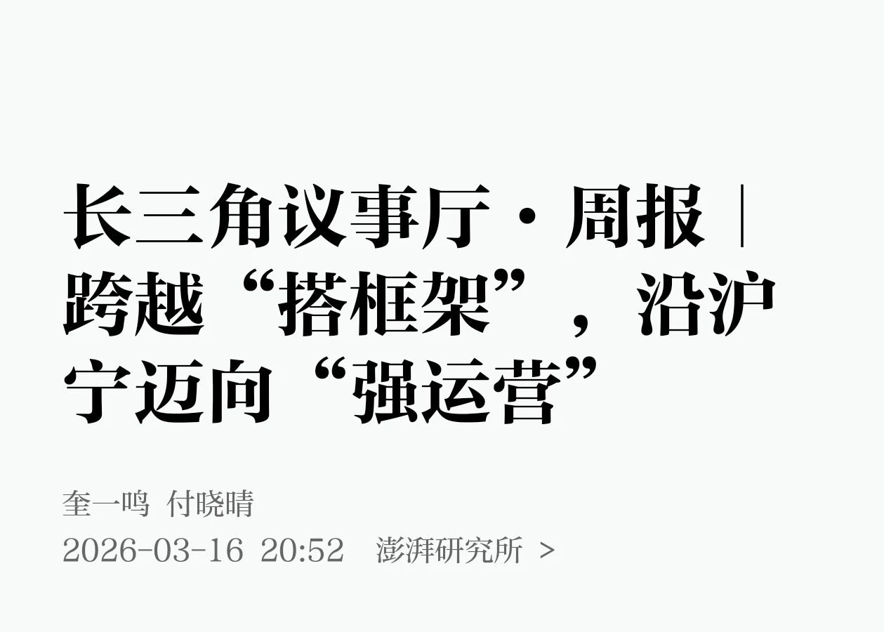 3月16日,澎湃研究所在《长三角议事厅·周报》刊发报道:跨越“搭框架”,沿沪宁迈向“强运营”