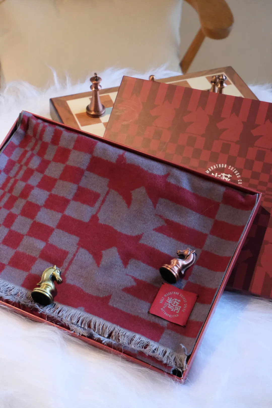 “半马苏河”马年限定围巾则以秋冬系列“摩登都市”为灵感基底,将蒙德里安风格的现代格纹与国际象棋中的经典马首元素巧妙结合。酒红底色低调典雅,图案蕴含跃动的智慧与优雅的博弈感,适合都市场合佩戴,彰显既有温度又有风度的当代气质。