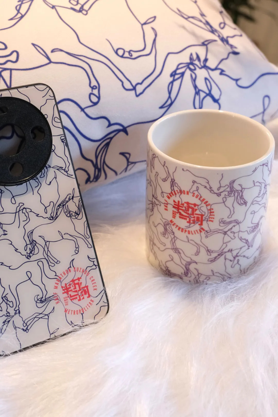 万马奔腾帆布袋,以“月白骏鸣”与“月影骑踪”两款设计,演绎昼夜交替间的城市脉动。图案中融入了苏州河水波纹的倒影元素,让骏马的奔腾与河流的蜿蜒在光影间交融,既呼应普陀区如骏马般昼夜不息的发展节奏,也暗合马拉松跑者坚定向前的精神写照。一座城的奋进、一湾水的灵动与个人的奔跑于一方帆布袋上呈现,传递奋斗不息的力量。