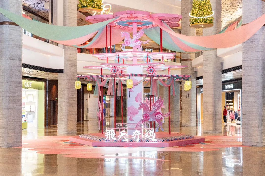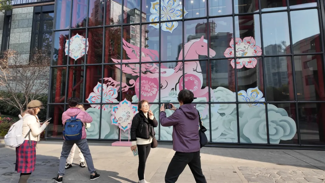 步入商场室内中庭,一座复刻自敦煌藻井纹样的中心装置尤为引人注目。这座以“飞天奇遇”为主题的沉浸式布景,巧妙聚焦马年,将莫高窟经典的翼马形象置于视觉核心,辅以藻井、飞天等经典元素融入现代商业空间,为市民打造了一处“不必远行,自有山河”的都市文旅秘境。室外西大门则布置了巨幅敦煌主题画面,使历史壁画与摩登建筑对话,吸引不少市民驻足拍照。