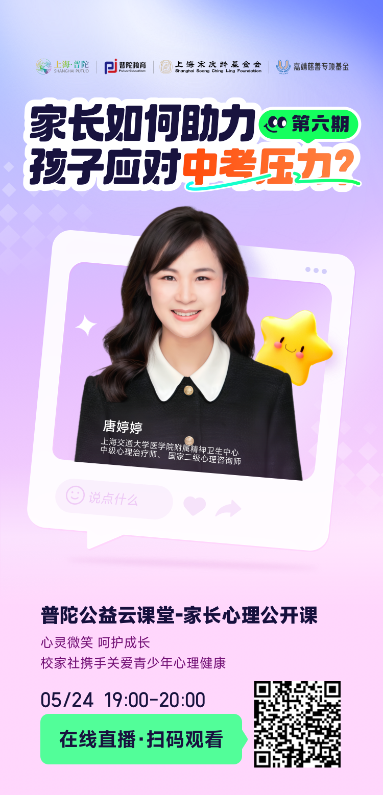 访谈摘要:本期普陀公益云课堂·家长心理公开课聚焦的是很多中考考生家长感到困扰的问题:孩子考前压力大,却不知该如何缓解,甚至比孩子还要紧张和焦虑。来自上海精神卫生中心的专家唐婷婷将走进课堂,和主持人一起畅聊《家长如何助力孩子应对中考压力》,通过一些实际的案例,让家长们找到自己情绪控制和压力缓解的方法,为孩子营造一个轻松的氛围。