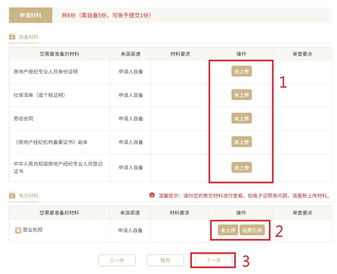 第二步:依据“材料要求”上传材料(材料必须为为 PDF 格式),材料上传完毕后点击“下一步”按钮。