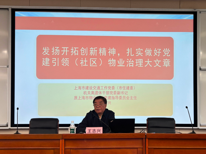 原上海市物业管理行业党建指导委员会主任、市物业协会党支部书记王志兴讲授课程《党建引领物业治理》。他从“物业服务行业的基本特征及在社区治理中的地位作用”“物业服务行业发展存在的问题(乱象)、原因分析和面临的新形势新要求”“坚持党建引领物业治理,基层政府部门应该把握的重点问题”三方面讲述了街镇工作人员在新形势下可能面临的问题,强调了坚持党建引领的必要性。