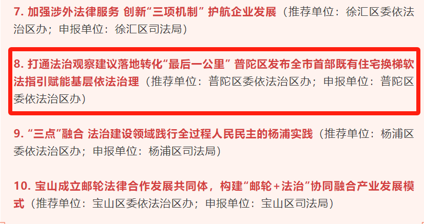 2024年度上海市法治建设十佳优秀案例、十佳提名优秀案例出炉,普陀区《打通法治观察建议落地转化“最后一公里”普陀区发布全市首部既有住宅换梯软法指引赋能基层依法治理》案例荣获2024年度上海市法治建设十佳优秀案例。