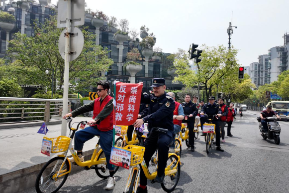 街道联合共享单车平台,在中远两湾城西区1号门附近投放50辆定制版共享单车,车头的国安标语与反邪旗帜交相辉映。由街道各部门人员、执法力量、社区反邪志愿者及企业职工组成的“苏河普法骑行队”,在苏河步道举行启动仪式后,沿中潭路-清水湾路主干道巡回行进,沿途发放反邪手册,宣传涉邪教类线索举报奖励机制,收获市民热烈响应。