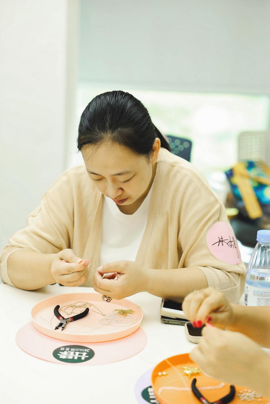 参与者们纷纷化身“手作达人”:有的专注缠绕丝线,有的细心搭配珠串,有的与邻座交流配色灵感……现场笑语不断,一枚枚精致的腰配逐渐成型。“这个跟我常穿的改良旗袍很配!”“原来传统手作这么有趣,回家要再做一个送给妈妈!”