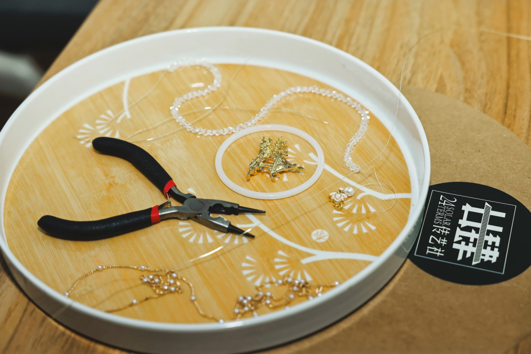 主办方特别邀请廿肆传习社的非遗手作导师桃子现场教学,带领参与者用玛瑙、流苏、玉珠、铜线等传统元素,制作兼具古典韵味与现代审美的时尚腰配。“腰配是中国传统服饰的重要配饰,既能点缀服装,也能展现个人风格——今天教大家做的这款,融合了盘扣工艺和流苏元素,日常搭配旗袍、连衣裙都很合适。”导师边讲解边示范,从材料选择到编织手法,一步步耐心指导。