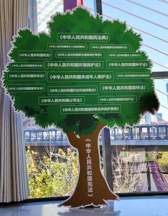 继续往上,三层盎然生机的生态意境带你解锁“宪法根本法”的硬核身份。这里以承载和谐共生理念的自然格调为基调,凸显宪法是根本法的核心地位。异形主题展板以“大树”为创意原型,生动展现宪法作为根本法与其他法律的关系,法治生态的“根基”作用一目了然。