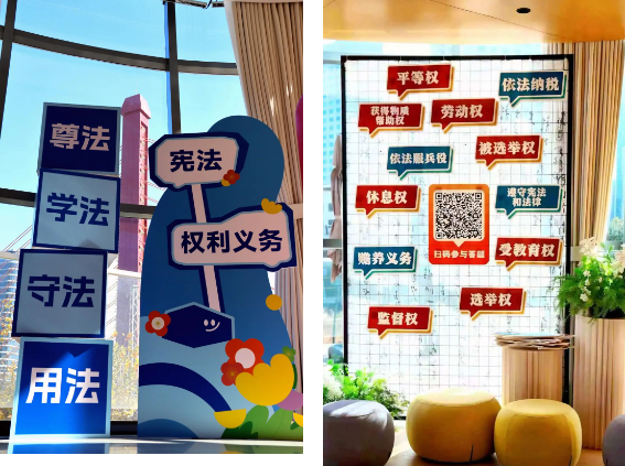 接着拾级而上,二层清新明快的互动场景切换普法新频道,这里以契合自由平等内核的清朗格调为主,围绕“公民的权利义务”展开。网格展架上,选举权、监督权、受教育权等公民基本权利,与遵守宪法法律、依法服兵役、依法纳税等法定义务一一列明,参观者可通过点赞贴纸为“权利与义务”点赞互动;展区内设置的二维码答题游戏,将抽象的法律知识转化为趣味问答,露台玻璃上还张贴了具体条款,让你在轻松参与中吃透法律知识点,进一步强化“权利义务伴我行”的认知。