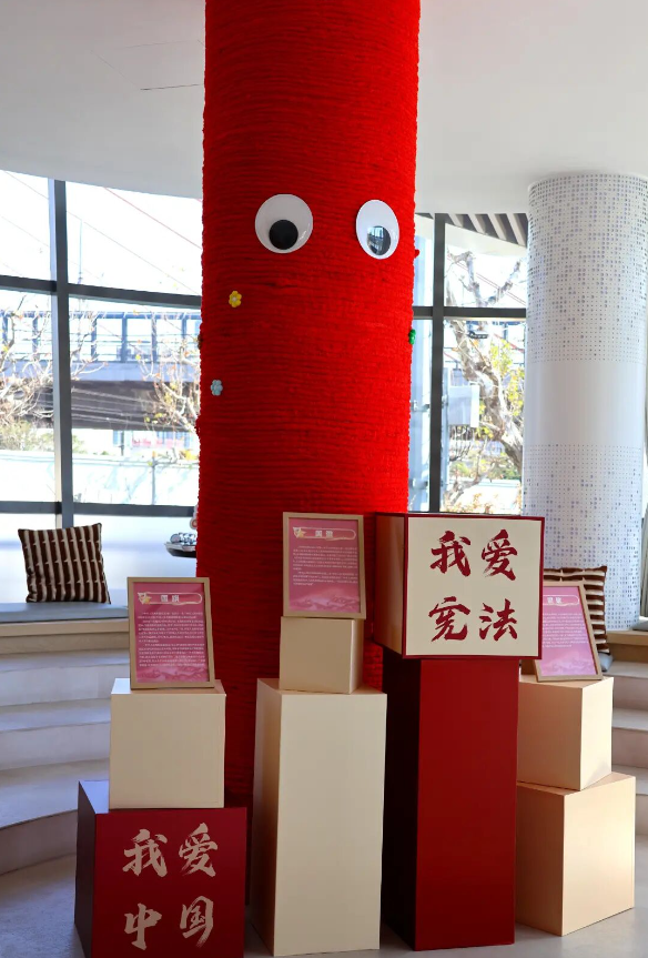 踏入“半马苏河”法治驿站,一层庄重的家国氛围率先扑面而来,这里以彰显国家尊严的庄重格调为核心,与复古质感的旋转楼梯交相呼应,聚焦“宪法·国家象征”主题。展区内,国旗、国徽的设计历程、象征意义及相关法律规定通过图文展板清晰呈现;进门处的打卡装置记录足迹,缠绕主题丝带、搭配爱心抱枕的“宪法拥抱”打卡点,更让庄严的宪法多了几分温度,传递出“美好生活,宪法相伴”的核心理念。