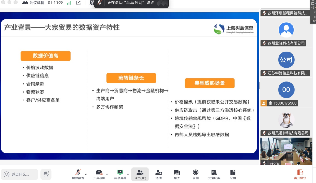 本次沙龙精准聚焦企业发展痛点,为沿沪宁大宗商品贸易供应链相关企业提供专业化合规与安全指导。活动中,上海树盈信息技术有限公司以“大宗商品贸易行业数据安全落地”为主题,从产业背景、法律法规、监管趋势及实操路径展开分享,输出可落地的数据安全指南,助力企业筑牢安全屏障。区公安分局网安支队民警结合实战案例,阐释网络安全重要意义,讲解数据泄露防范举措,解读《计算机信息网络国际联网安全保护管理办法》核心要求,明确网站、APP 等公安互联网备案流程,并从日常运营细节普及防护知识,全面提升企业全员安全意识。