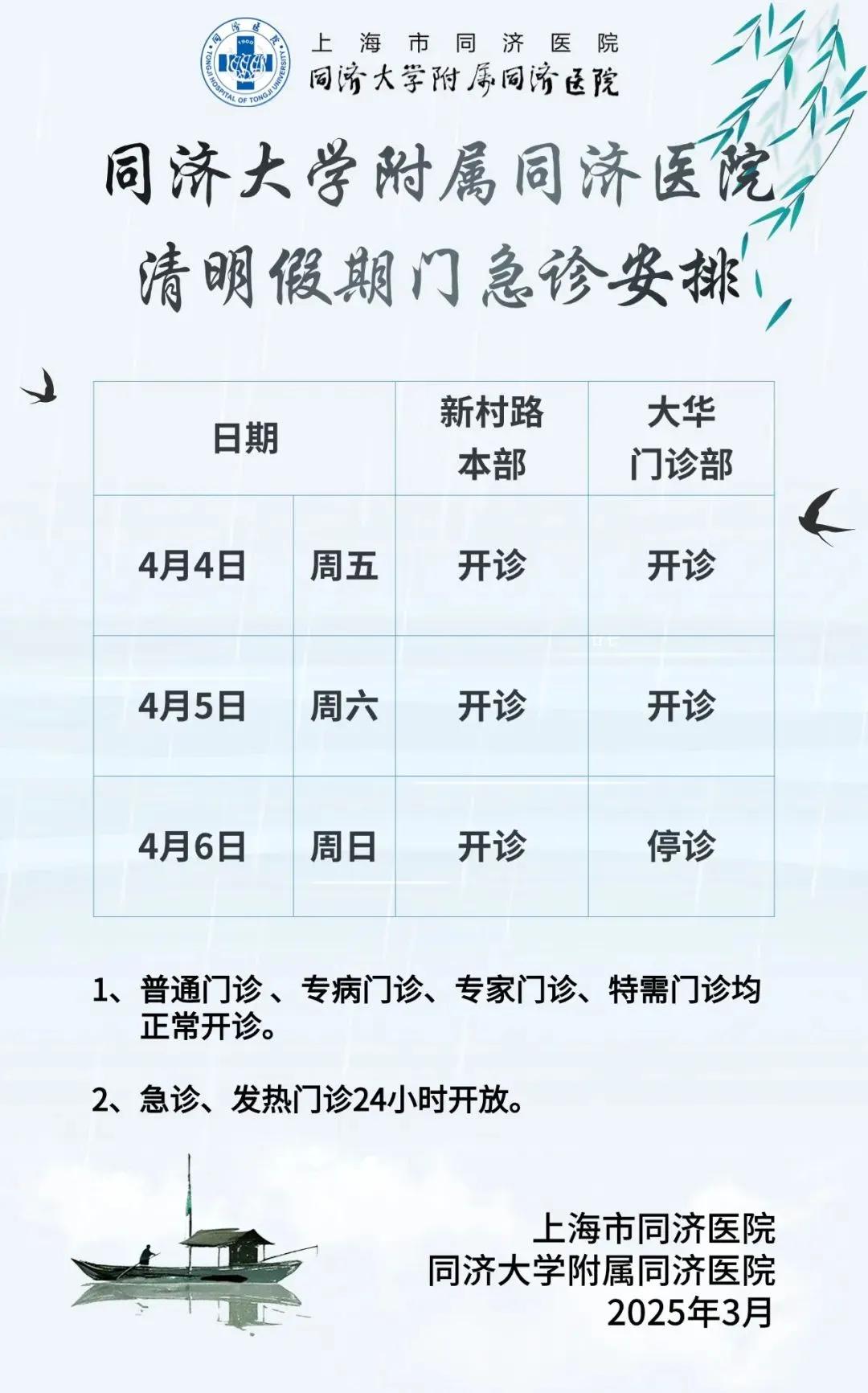 【公告】同济大学附属同济医院2025年清明假期门急诊安排