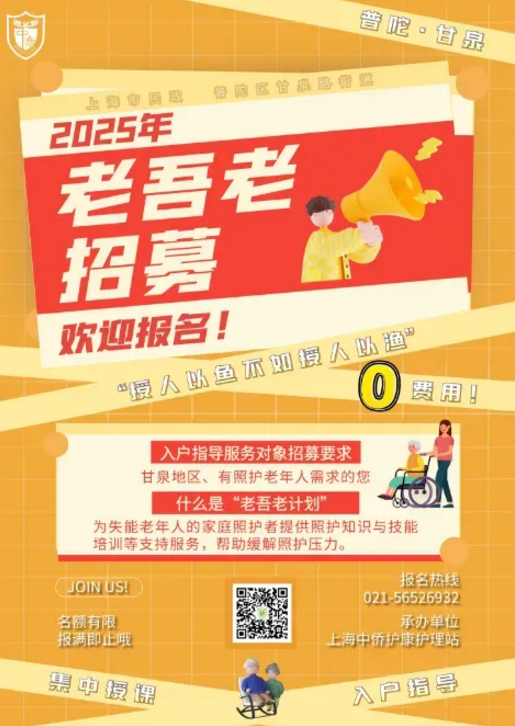 2025年04月14日 来源: 甘泉路街道家有一老,如有一宝。但随着人口老龄化加速,照顾家中失能、失智老人,成了不少家庭的难题。别担心,甘泉路街道 2025“老吾老计划”项目暖心上线,免费为大家送福利,为家有失能、失智老年人的家庭照护者提供专业的照护知识与技能培训服务,全方位提升老年生活幸福感,家属们的福音来啦!