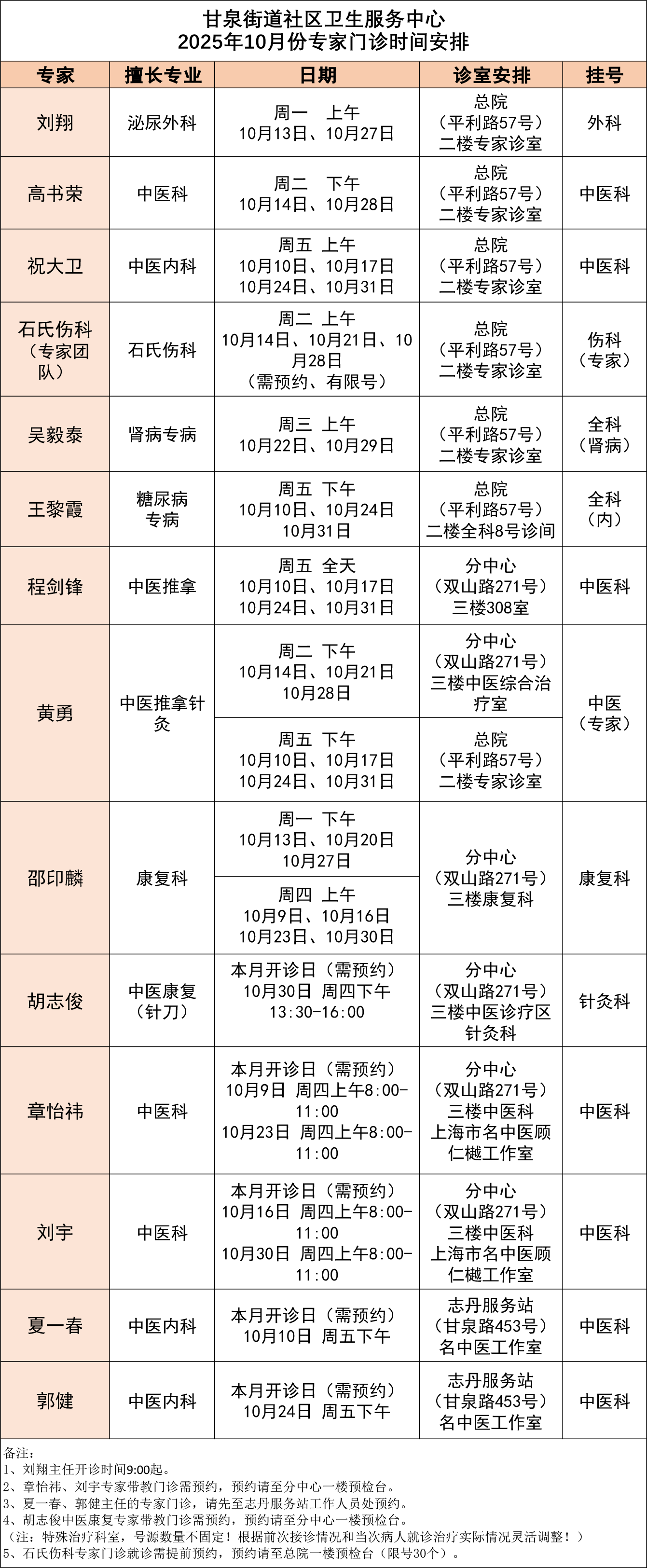 【“泉”心小贴士】甘泉社卫10月专家门诊安排