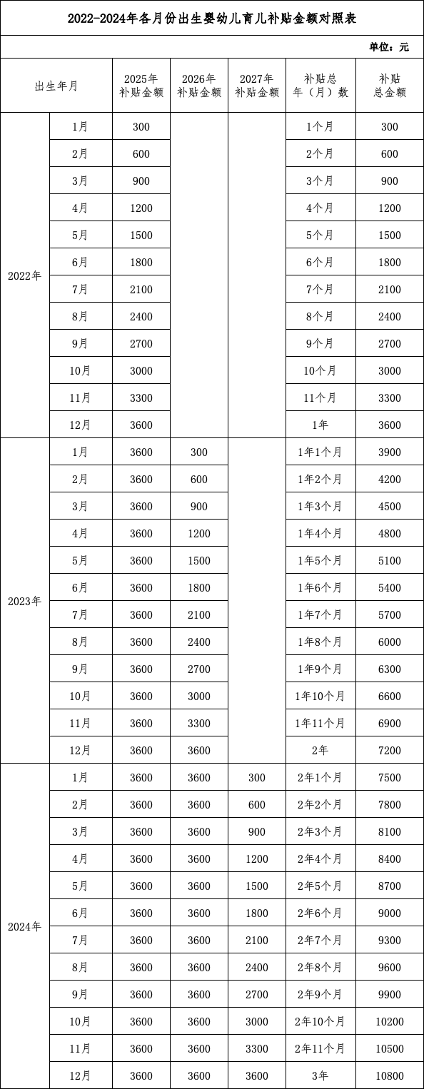答:育儿补贴按年发放。补贴标准为每孩每年3600元,至婴幼儿年满3周岁。1.对于2025年1月1日及以后出生的婴幼儿,可连续申领3年补贴,共计10800元。2.对于2025年1月1日之前出生且未满3周岁的婴幼儿,可按应补贴月数折算补贴金额。先申领整年补贴,再申领剩余月份补贴。具体算法见下表。