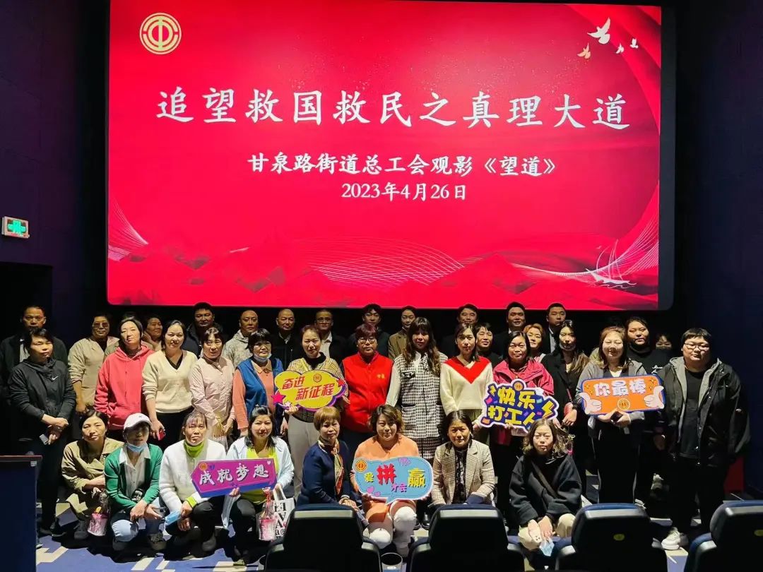 4月26日下午,甘泉路街道总工会组织辖区内各级职工和新就业形态劳动者,集体观看红色教育电影《望道》,电影展现了陈望道同志为了追求革命理想,废寝忘食翻译《共产党宣言》的故事,一群风华正茂的青年人们为了坚守真理与信仰,为了寻找国家的出路上下求索,无数仁人志士和革命先驱为了民族复兴、人民幸福不惜献出宝贵的生命……