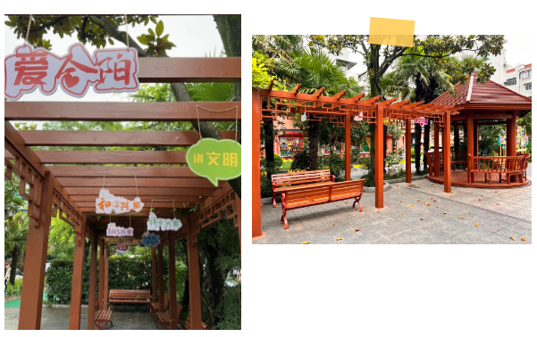 2022年底,考虑到小区东面的两个小广场,供居民休憩的亭子座椅经风吹雨淋,呈现亭柱破损、漆面脱落;同时,小花园内设施简单,可供孩童游玩区域甚少。