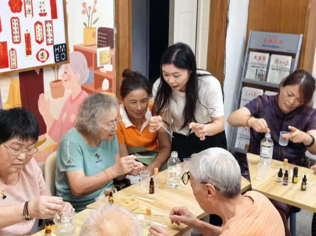 随后进入大家最受期待的DIY制作环节。居民们围坐在一起,在老师的指导下,小心翼翼地选取心仪的精油,按照比例调配香水。“我想加一点柑橘精油,闻起来清爽;再放些桂花精油,快到中秋了,得有花香的温柔。”一位居民一边调试,一边和身边的邻居分享自己的想法。直播镜头同步捕捉着大家专注的神情和细致的操作步骤,线上老人通过评论区点赞互动,让温暖在镜头两端流转。
