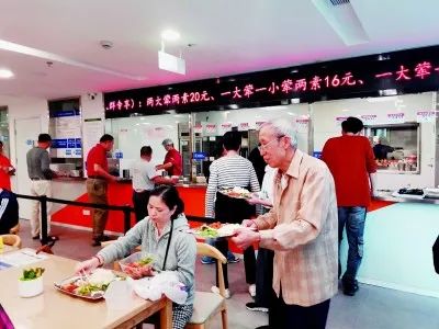 中午时分,二楼的社区食堂已有老年人在取餐窗口前排起了队。80多岁的李爷爷刚打完一份“一荤两素”餐。“我就住这附近,走几步路就到了。这里食堂的饭菜干净卫生,老年人还有优惠套餐,我和老伴儿都来这里吃饭!”