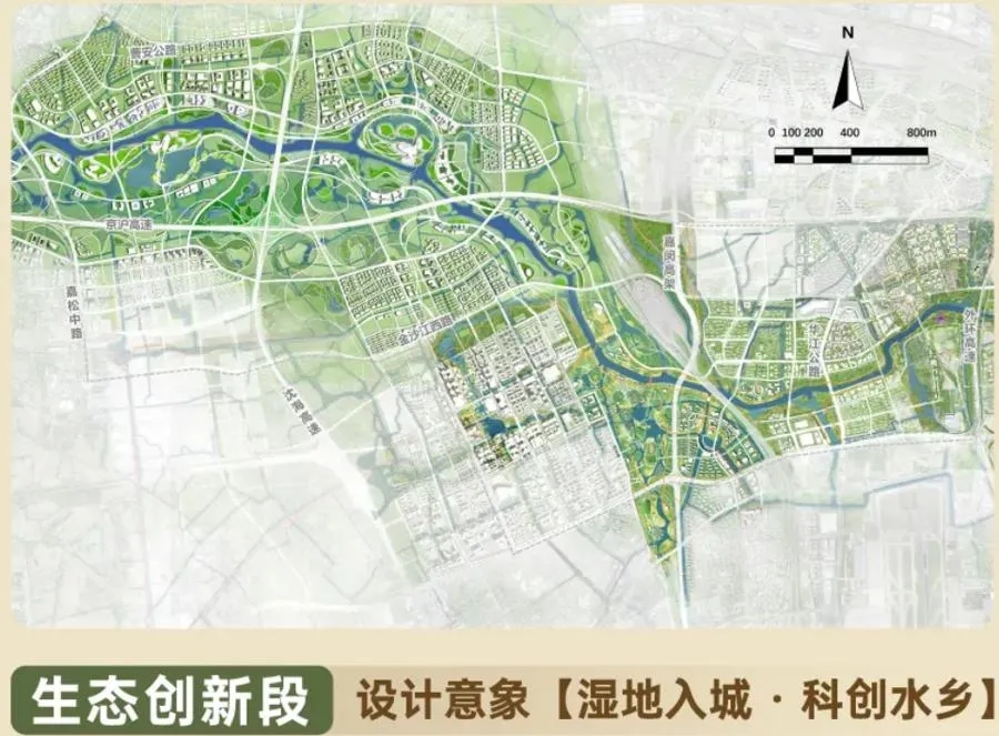 生态创新段东起外环吴淞江桥西至嘉松北路吴淞江桥,规划探索蓝绿筑底、湿地入城等空间形态,打造人与自然融合共生的环境,展现江南人文意蕴的新兴科创滨水区。