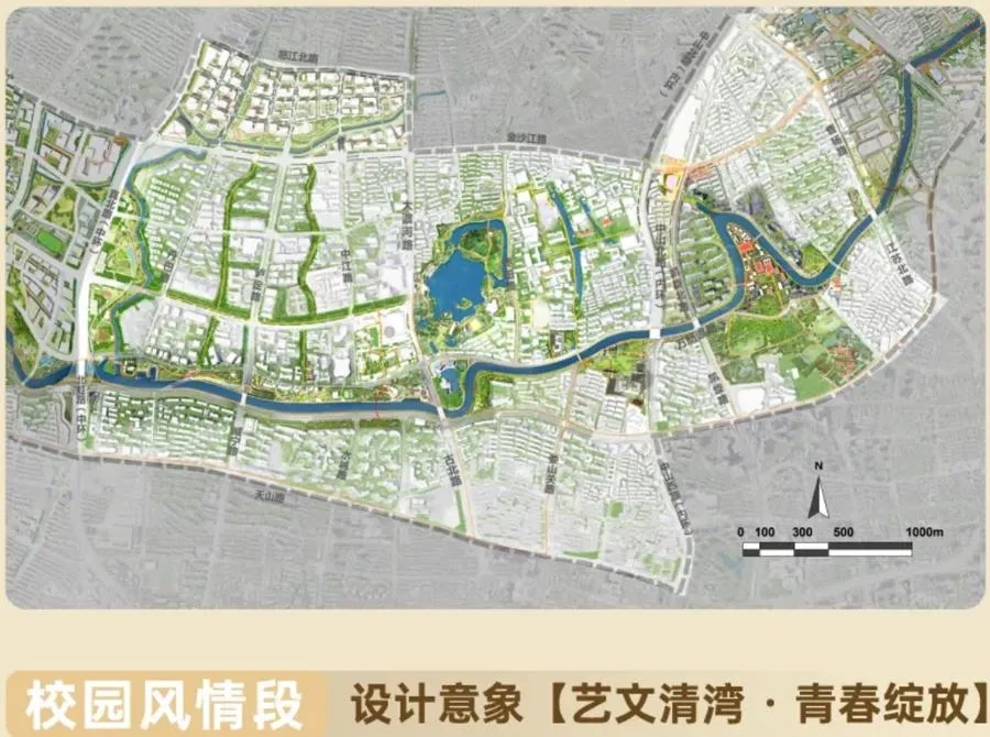 校园风情段范围在曹杨路桥—真北路桥,规划加强华东政法大学等高校校园和城市开放融合,突出知性、青春、活力、奔放的滨水区特色。