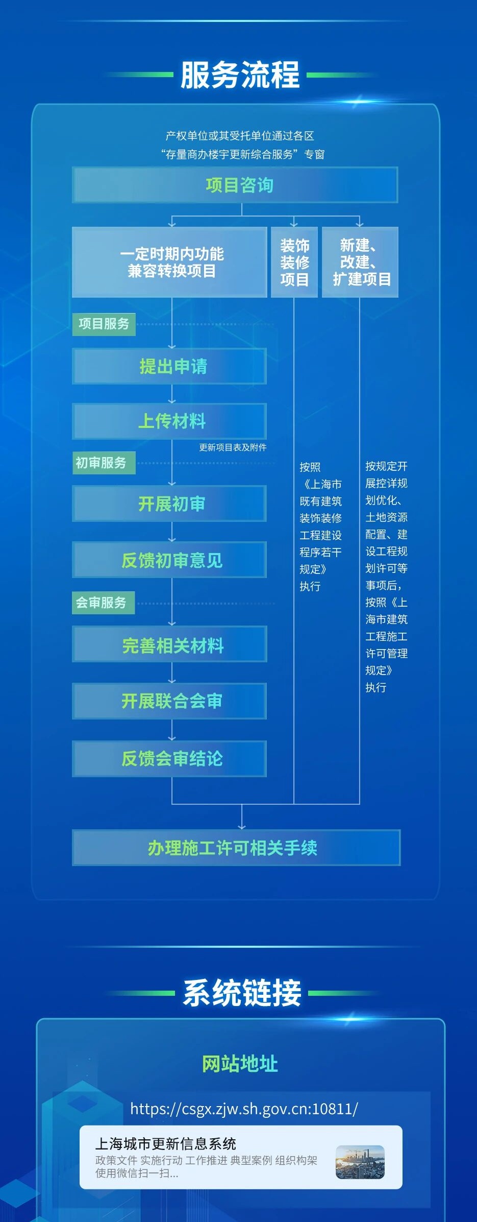 为进一步健全“政府引导、市场运作、公众参与”的可持续城市更新模式,推动本市商办楼宇高质量发展,更好服务各类市场主体,做好存量商办楼宇更新提升工作,近期,本市建立了存量商办楼宇更新提升“线下一口咨询,线上一口受理”的服务、审批机制。线下各区将依托区政务服务中心大厅,设置“存量商办楼宇更新综合服务”专窗,提供业务咨询服务。线上在市城市更新信息系统向社会开放“商办楼宇专项平台”,涵盖企业申请服务、更新案例、政策标准等内容。详见图解↓