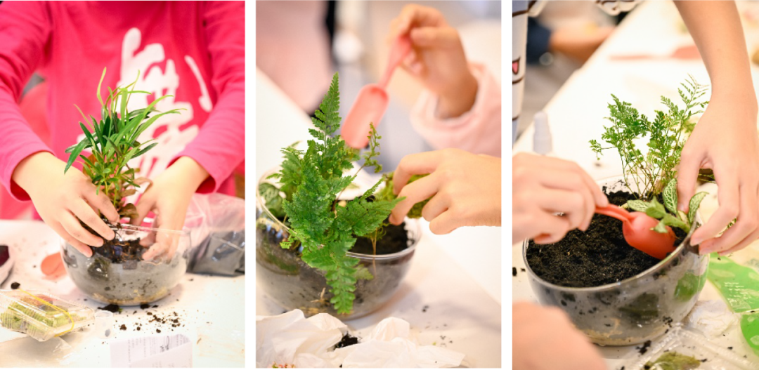 最受期待的动手创作环节随后登场。在老师们的专业指导下,孩子们化身“小小艺术家”,开启创意十足的微景观创作。这不仅是趣味手工体验,更是一堂鲜活的景观设计启蒙课:大家在实践中掌握前景、主景与背景的布局技巧,探索水系形态的塑造手法,琢磨植物层次与色彩的搭配逻辑,领悟适度留白的美学智慧。