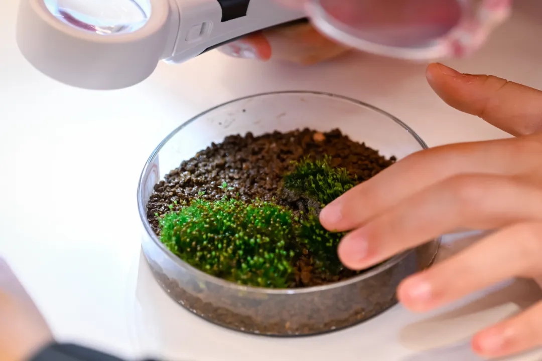 科普环节落幕,趣味观察随即开启。泽葵老师为孩子们分发苔藓标本与放大镜,邀请大家近距离探秘立碗藓、白发藓、凤尾藓等常见品类的微观世界,直观感受这些小型植物的精巧形态与自然之美。