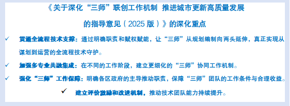 一是深入推进“三师”联创机制探索。2023年,为破解城市更新的复杂性问题,市规划资源局创新“三师”联创工作机制,让“三师”团队打通专业技术壁垒、各展所长、集成联创、形成合力,实现专业的人做专业的事,围绕更新单元开展规划统领、资源统筹、设计赋能,形成符合地区定位、面向市场的好方案好产品,实现“1+1+1>3”的成效。2025年,项目组对全市 37个已取得阶段性成果的更新单元进行评估,对46家“三师”团队、13家实施主体、30家联盟成员进行深度访谈与问卷调查。调研显示,超过90%的相关单位了解并认可这一机制,超半数团队获评“优秀”,证明了其价值。但实践也暴露了一些问题,最突出的是“三师”在项目实施和运营阶段参与度下降,出现阶段脱节,其专业意见有时也缺乏强有力的授权保障等。综合以上意见,同年上海更新迭代关于“三师”联创的新版指导意见,对贯通全流程技术支撑、强化多专业共融集成、加强工作组织保障、促进技术团队自身建设等方面着重深化,让“三师”成为贯穿始终的“技术守护者”。