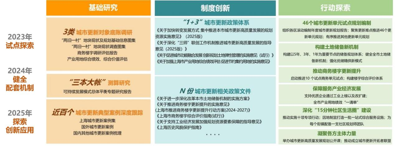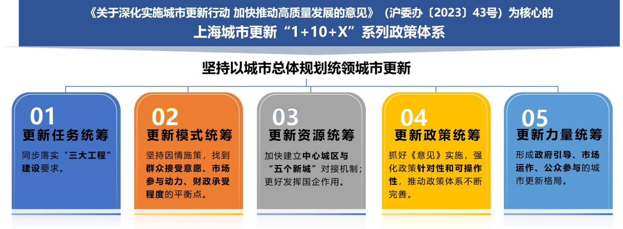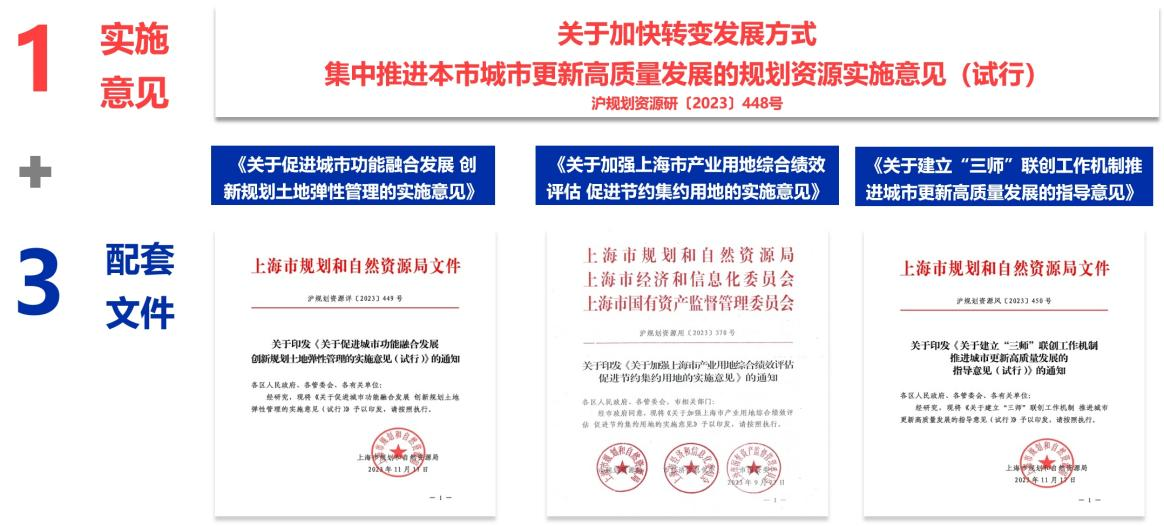 一是升级形成系列城市更新规划政策工具箱。2023年,上海在全国率先出台 “1+3”城市更新规划资源政策体系,为全市更新工作提供了清晰的行动指南。