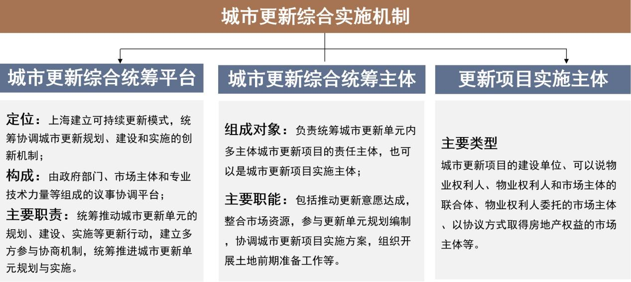 二是创新政府与市场主体共同实施新路径。明确了专业团队如何生成好方案,还需厘清“由谁牵头”问题,调研中发现单一市场主体往往难以胜任更新单元整体统筹工作。借鉴东京“政府-UR机构-产权人”三方共治的国际经验以及长宁武夷路街区等本地实践经验,提出适配本土情况的“城市更新综合统筹平台、城市更新综合统筹主体和更新项目实施主体”的综合实施机制,这一创新机制已被正式写入2025年发布的城市更新政策文件,形成了稳定的制度供给。
