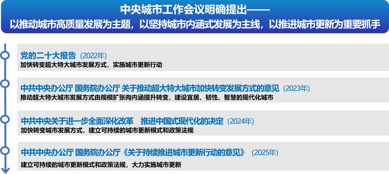 党的二十大报告明确提出“加快转变超大特大城市发展方式,实施城市更新行动”,将城市更新提升至前所未有的战略高度。紧随其后,一系列中央文件与会议持续强调,推动城市从规模扩张转向内涵提升,建立可持续的城市更新模式。这些顶层设计传递出一个清晰信号:“城市更新”不再是零敲碎打的工程,而是推动超大城市发展方式根本性转变的核心战略抓手。