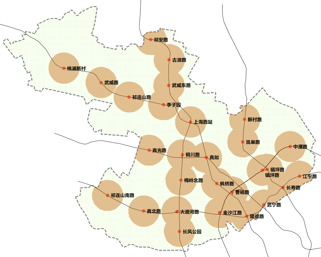 配合市级北横中运量的建设运营,完善长寿路沿线中运量站点周边的地面公交站点布设 |