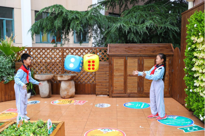 阳光是近视防控的“疫苗”。在智能视力自测区紧邻的露天平台被打造成了明眸花园,花园里不仅种植了绿植养眼,还有半马苏河地标与护眼知识相结合,做成特色的护眼游戏地图,让学生们在游戏中了解眼健康知识。
