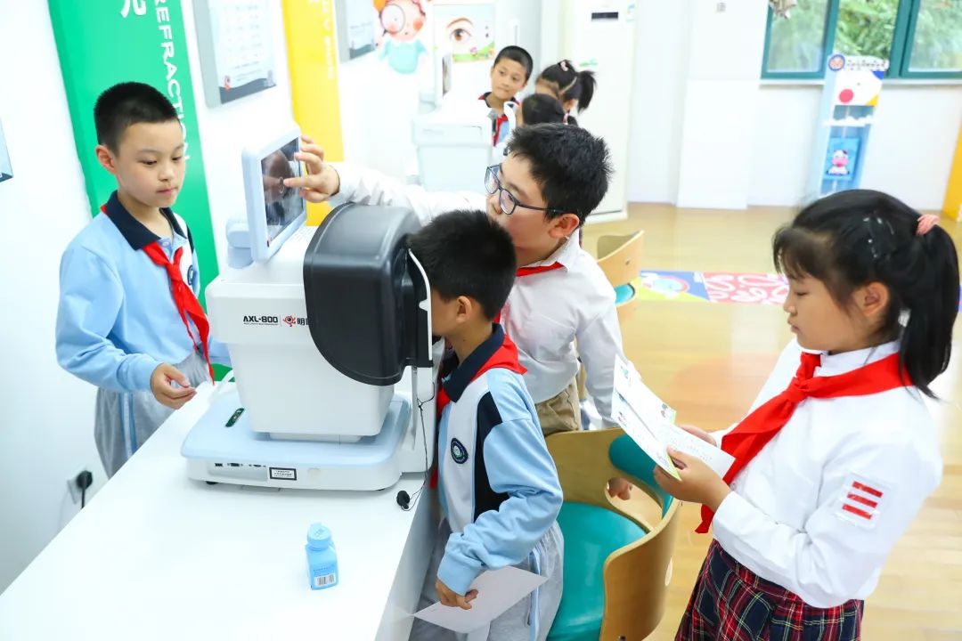 “这个是全自动眼轴长测量仪,您坐下来,把眼睛对准检测口,我在屏幕上进行对焦,仪器就会自动检测出您的眼睛轴长。”三年级学生王霖俊邀请记者体验检测设备。他告诉记者,自己的近视比较深,家长会定期带他去医院进行眼科检查,现在学校有了专业的检测设备,老师会指导他使用,如今自己已经可以自主检测眼睛情况了。“我还会指导其他同学使用检测设备,这样我们就能及时掌握自己的视力和眼睛情况。”
