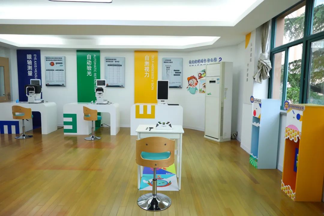 位于学校内的标准化近视综合防控基地,由智能视力自测区、科普角、“目”浴阳光空间(明眸花园)、明眸长廊和护眼长廊等组成,形成了室内外联动的近视综合防控空间。