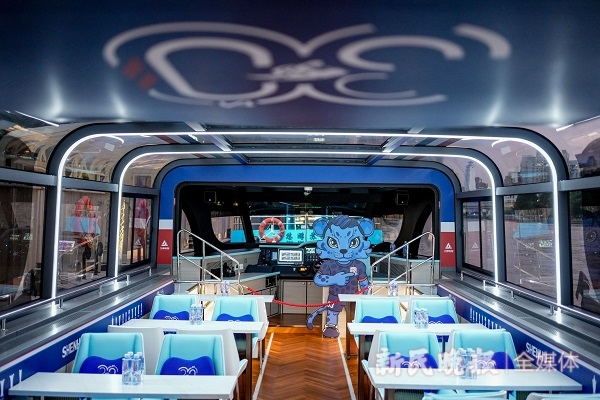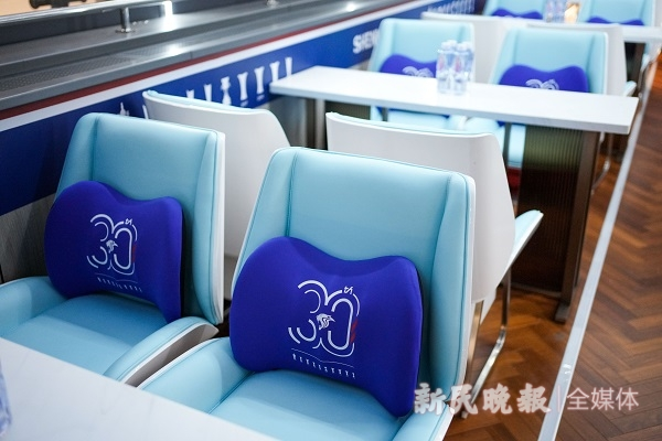 记者登上了“璀璨星河”游船,船舱内部敞亮,船上摆有餐桌和座椅,桌上摆着餐具,两边是玻璃幕墙,空间更明亮通透,可360度欣赏苏州河两岸景色;游船的玻璃顶可以滑动开合,更具开放性和亲水性,满足了市民游客对于开阔式游船空间和敞开式观光体验的需求;船内桌椅布局可灵活变换,形成多种场景模式,还融入了休闲娱乐及小食酒水服务;新游船均配备纯电动新能源推进系统,实现了零排放、零污染的绿色航行。